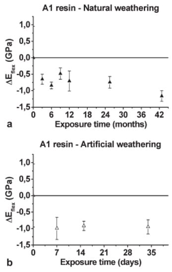 Variations in the flexural modulus of elasticity (ΔEflex) measured on A1 resin relative to the initial value calculated for unexposed specimens measured during (a) natural weathering and (b) artificial aging. Reprinted with permission [52].