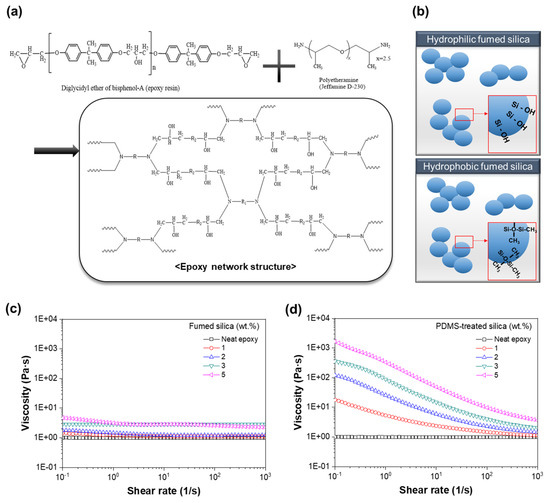 After sufficiently dispersing the fumed silica with different surface functional groups in the epoxy resin (YD-115) through mixing and ultrasonication, the steady shear viscosities of the mixtures with different silica contents were measured (Figure 1c,d). As shown in Figure 1c, the untreated silica suspensions exhibited Newtonian fluid behavior, whereas the viscosities of the epoxy/PDMS-treated silica mixtures showed a strong dependence on the silica content, as shown in Figure 1d. The viscosity of the mixtures decreased with increase in the shear rate. This characteristic, called the shear thinning behavior, is typical of non-Newtonian fluids. Shirono H. et al., measured the viscosity of fumed silica by surface treatment with silanes with different alkyl chain lengths on the surface. Suspensions of untreated fumed silica and low chain length treated fumed silica showed Newtonian behavior. However, strong shear thinning behavior was observed in the surface-modified fumed silica with longer alkyl groups. Additionally, Mai, V.D. et al., showed a shear thinning behavior in which the viscosity of the epoxy resin/nano-Al2O3 composite material decreased as the shear rate increased [14,28]. Compared with the results of published literature, it shows similar research results in which the behavior of Newtonian and non-Newtonian fluids according to the different surface treatment of the filler. The shear thinning behavior of the mixtures can be attributed to the redistribution of fillers and their directions.