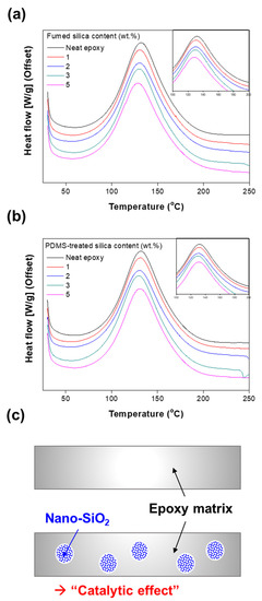 DSC curves of epoxy nanocomposites with (a) fumed silica and (b) PDMS-treated fumed silica. (c) Schematic of the catalytic effect.