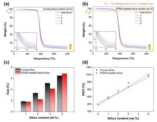 Thermograms of epoxy composites with (a) fumed silica and (b) PDMS-treated fumed silica. (c) Gap of char weight percent at 800 °C. (d) Integral procedural decomposition temperature (IPDT) of the epoxy/fumed silica composites.