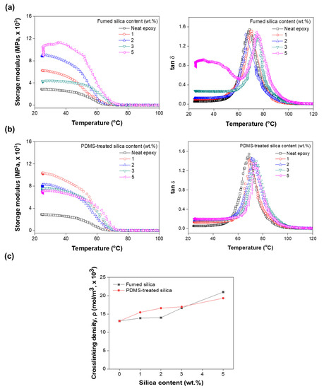 Variations in the storage modulus and tan 𝛿 values of the epoxy composites as functions of (a) fumed silica and (b) PDMS-treated fumed silica contents. (c) Crosslinking densities of epoxy/fumed silica and epoxy/PDMS-treated silica composites with silica content.
