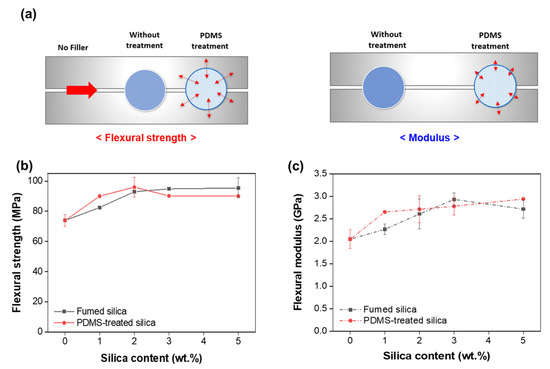 Flexural tests were performed to confirm the mechanical properties of the epoxy composite material. The interaction between the nanofiller particles and the matrix was confirmed by applying a continuous force to the structure. Figure 6b,c show that the flexural strength and modulus increase with increase in the filler content for untreated fumed silica composite. In the PDMS-treated fumed silica/epoxy composite, the flexural strength is maximum at 2 wt.% and then decreases; however, the modulus continues to increase. The attraction between the polymer and the filler gave rise to the observed flexural strength of the composite, leading to an increase in its maximum bending strength. In particular, the PDMS-treated composite showed maximum strength at a low silica content owing to the strong interaction of the fumed silica particles with the polymer matrix. The flexural modulus of a material is defined as the stress that resists deformation in the material. The modulus of elasticity of the PDMS surface-treated fumed silica/epoxy composite is slightly higher than that of the untreated fumed silica/epoxy composite. The obtained flexural modulus indicates weak interaction between the filler and the polymer matrix, contrary to the case of flexural strength (Figure 6a).