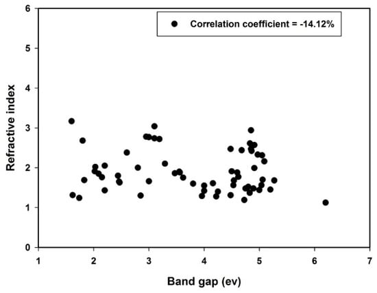 The refractive indices and energy gaps of polyvinyl alcohol composites used for developing PSVR and OLR models were extracted from the literature [,,,,,,,,,,,,]. The energy gaps and refractive indices dataset was extracted from sixty-three composite samples of polyvinyl alcohol. Increments in the concentrations of fillers within the polymer matrices influence the refractive indices of the polymer composites due to crosslink formation in the respective matrices. The refractive index of a polymer changes with the density of the crosslinking because of the tightness and closeness between the chains []. Similarly, impurities (fillers) incorporated into the polymer matrix lead to trap-level formation within the band gap, which consequently affects the energy gap of the composite []. The correlation cross-plot between the refractive indices and energy gaps of polyvinyl alcohol composites is presented in Figure 1. It can be inferred from the figure that there exists no linear relationship between refractive index and energy gap for the investigated polymeric composites.