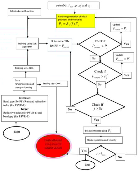 Support vector regression (SVR) belongs to the category of nonlinear intelligent algorithms. It operates according to the principle of structural risk minimization, using statistical learning []. It addresses nonlinear problems conveniently through nonlinear mapping functions and efficiently handles small samples of datasets with excellent predictive outputs [,]. The algorithm has enjoyed wider applicability lately due to its robust mathematical computation and global convergence feature [,,,,,]. The hyperparameters associated with SVR include the epsilon, penalty factor, kernel function, and kernel parameter. Accurate determination of the hyperparameters of the algorithm remains the key to the precision of the model. Tuning of these hyperparameters is often achieved through manual searching, grid searching, or the use of heuristic algorithms. Among the heuristic algorithms, the particle swarm optimization (PSO) algorithm has demonstrated a high rate of success and excellent processing time [,]. It avoids local convergence and attains fast convergence rate without doing so prematurely. Excellent features of PSO were combined with those of SVR to develop PSVR-based models so that the optical properties of polyvinyl alcohol composites could be estimated with high precision. We developed hybrid intelligent models for determining the influences of fillers or dopants on the refractive index (n) and energy gap (E) of polyvinyl alcohol using particle swarm-based support vector regression (PSVR) algorithms. The performances of the developed hybrid intelligent models were compared with those of ordinary linear regression (OLR)-based models using various performance metrics.