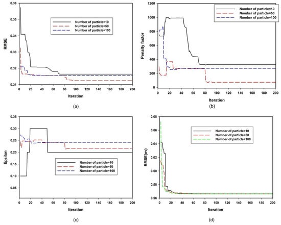 The influences of the number of swarm particles on the exploration and exploitation capacities of the developed n-PSVR and E-PSVR models are presented in Figure 3. The figure also includes the sensitivity of each of the developed models to the hyperparameters, given various numbers of swarm particles. A balance should be maintained between the exploration and exploitation capacities of the PSO algorithm. When a small number of particles explores a search space, the exploration ability of the algorithm might be hindered. To enhance this exploration capacity by populating the search space with many particles, the exploitation strength of the algorithm might be affected. Figure 3a presents the convergence of the developed n-PSVR model as the number of iterations varies. Premature convergence was observed when the number of particles was set to ten. The figure shows fifty particles in a swarm led to global convergence. The algorithm was trapped in local solutions as the number of particles in the swarm increased from fifty to one hundred. This can be attributed to the deterioration of the exploitation capacity of the algorithm, as the search space was well explored with fifty particles. Figure 3b shows the variation of the penalty factor with the number of particles in the swarm. Less deviation of the estimated refractive index was observed when fifty particles explored the search space. The sensitivity of the developed n-PSVR model to error threshold epsilon is presented in Figure 3c. Although the convergence began at different points when different numbers of swam particles explored the search space, the algorithm converged to the optimum error threshold with fifty particles. This signifies the robustness and precision of the developed model. Error convergence of the developed E-PSVR model is presented in Figure 3d. Irrespective of the number of particles exploiting the search space, the algorithm converged to the same global solution. This shows the robustness of the model we made to have enhanced exploitation and exploration capacities. Figure 3e presents the sensitivity of the E-PSVR model to the penalty factor with different numbers of swarm particles in the search space. The algorithm showed similar global convergence after sixty iterations. Figure 3f shows the sensitivity of the E-PSVR model to the value of error threshold epsilon. The model showed good convergence irrespective of the number of swarm particles. The details of the swarm particles that demonstrated optimum performance, as measured through lowest root mean square error (RMSE), are presented in Table 1. It should be noted that several kernel functions were investigated. The reported Gaussian kernel function showed superior performance over polynomial and sigmoid functions.