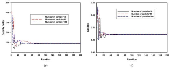 Convergence and sensitivity of the PSVR models. (a) Convergence of n-PSVR with various numbers of particles. (b) Sensitivity of n-PSVR to the penalty factor. (c) Sensitivity of n-PSVR to epsilon. (d) Convergence of E-PSVR with various numbers of particles. (e) Sensitivity of E-PSVR to the penalty factor. (f) Sensitivity of E-PSVR to epsilon.