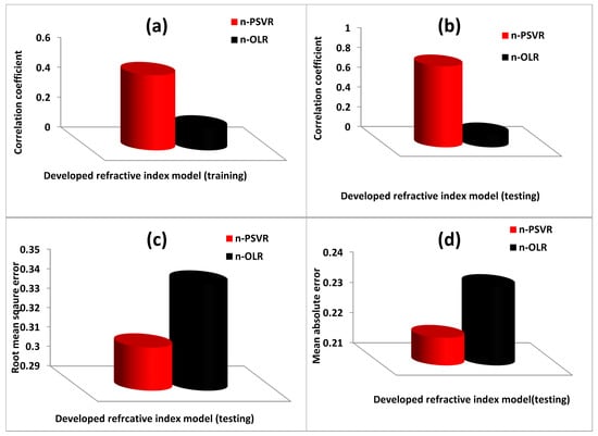 Performance of the developed n-PSVR model using various error metrics. (a) Correlation coefficient for each of the developed refractive index model during training phase (b) Correlation coefficient for each of the developed refractive index model during testing phase (c) Root mean square error for each of the developed refractive index model during training phase (d) Mean absolute error for each of the developed refractive index model during testing phase.