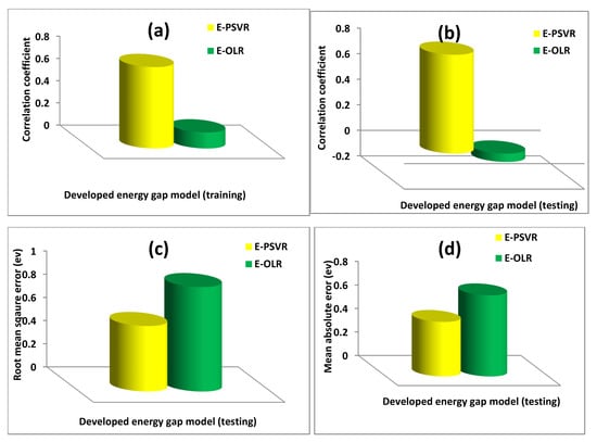 The E-PSVR, which can estimate the energy gaps of polyvinyl alcohol composites, performed better than the E-OLR model. The performance enhancement was 80.34% in terms of CC, on training data, as depicted by Figure 5a. Similar performance improvements of 108.46%, 37.28%, and 32.77% in CC, RMSE, and MAE, respectively, were obtained at the testing stage of model development, as presented in Figure 5b–d. The results with all error metrics of the performance evaluation at each stage of model development are presented in Table 2.