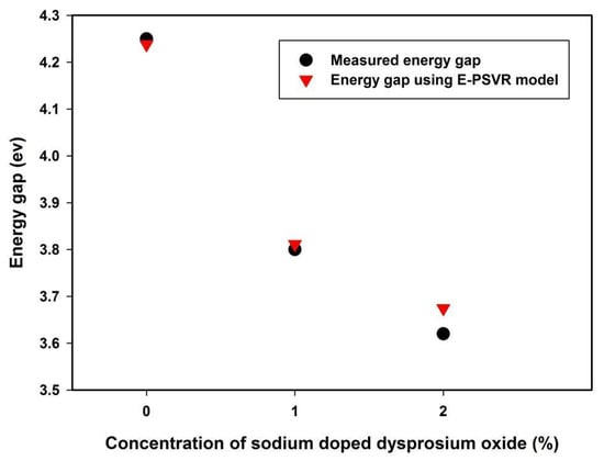 The effect of incorporating sodium-based dysprosium oxide on the energy gap of polyvinyl alcohol using is presented in Figure 6, which was calculated using E-PSVR. The results of the developed E-PSVR model match the measured values well [].
