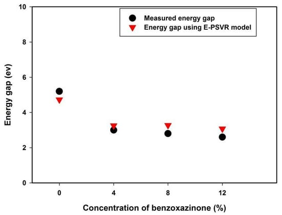 The energy gap lowering effect of incorporating benzoxazinone on polyvinyl alcohol, as obtained by the E-PSVR model, is presented in Figure 7. The figure also presents a comparison between the obtained outcomes of the model and the measured values [].