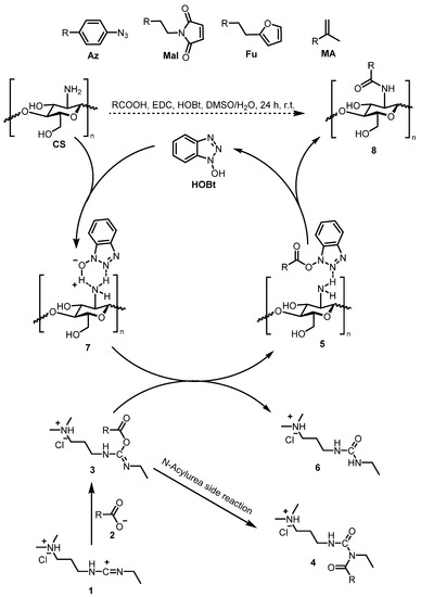 Cyclic form of reaction mechanism from EDC/HOBt mediated amide coupling for conjugation of different carboxylic acids (Az, Mal, Fu and MA) to CS, rearranged, redrawn and complementedfrom literature [11,24].