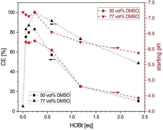 To optimize the CE of the reaction, the quantity of HOBt was systematically varied from catalytic (0.06–0.24 equivalents) to stoichiometric (0.59–2.37 equivalents) amounts (based on 1 equivalent CS) at two concentrations (50 vol% and 77 vol%) of DMSO. The starting pH, representing the pH value after adding 0.95 equivalents of EDC as final reagent to a batch, was also measured as a third parameter. One of the most noteworthy results, observable in Figure 2 is that CE was significantly increased when catalytic instead of stoichiometric amounts of HOBt were used. Given that most published conjugation experiments use stoichiometric amounts of HOBt [2,3,4,5,6,8,9,10,11,15,19], our finding represents an unexpected result at first sight. Indeed, a maximum of 81.3% CE at 0.24 equivalent of HOBt was found at 50% DMSO, already representing a drastic increase compared to initially tested conditions taken from literature [6]. Moreover, the CE can also be correlated with the starting pH. Accordingly, using stoichiometric amounts of HOBt, resulted in a decrease of starting pH similar to CE. Rather than simply acting as a catalyst and increasing reaction rates, it seems that HOBt also decreases pH of the reaction mixture and thereby CE as well.