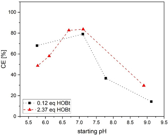 To validate the hypothesis and to differentiate between the influence of pH and HOBt on CE of the reaction another set of experiments was carried out. For both DMSO contents high CE at 0.12 equivalent HOBt and low CE at 2.37 equivalent HOBt were found in above experiments. These two extreme values were therefore used in two sets of reactions at a fixed DMSO content of 77 vol% and 0.95 equivalents of EDC. Here the starting pH was adjusted manually with 0.1 M NaOH or 0.1 M HCl directly before addition of EDC and varied between 5.8 and 9.0 while the amount of HOBt was kept fixed at 0.12 and 2.37 equivalents, respectively. In both cases, a similar maximum CE was found at a pH of 7.1 (Figure 3) This indicates the strong influence of pH on CE and shows that it is not necessary to use stoichiometric or higher amounts of HOBt to enhance the reaction.