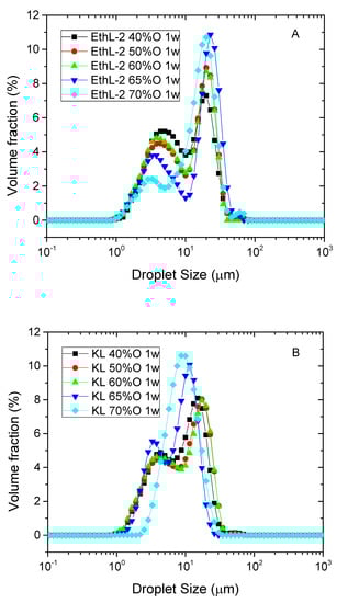 All lignin-based surfactants were able to emulsify silicone oil between 40 and 70 wt.% O at pH 13. Most emulsions showed a wide bimodal droplet size distribution (DSD), with a first peak of smaller height located at ca. 4 µm and a second main peak at around 20 µm (Figure 2).