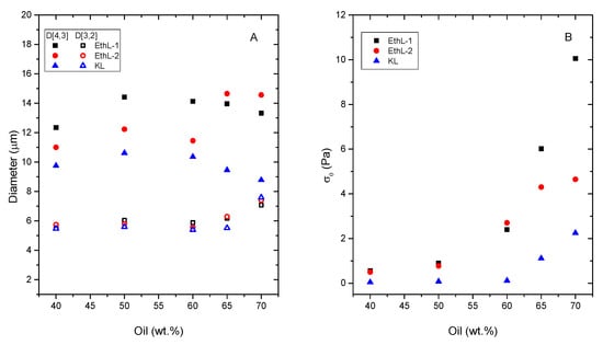 Given the range of shear rates studied and the Newtonian behaviour exhibited by the continuous phases shown in Figure 1, the observed shear thinning behaviour should be mainly attributed to a shear-induced deflocculation of the emulsion [27,28]. As expected, an increase in oil concentration leads to more viscous emulsions and with higher yields stress values (Figure 3 and Figure 4B). However, if emulsions with the same concentration of disperse phase are compared, emulsions stabilized with bioethanol-derived emulsifiers show higher yield stress values than emulsions stabilized by KL, despite kraft lignin leads to smaller Sauter (D3,2) (up to 65% O) and De-Brouckere (D4,3) mean diameters (Figure 4B).