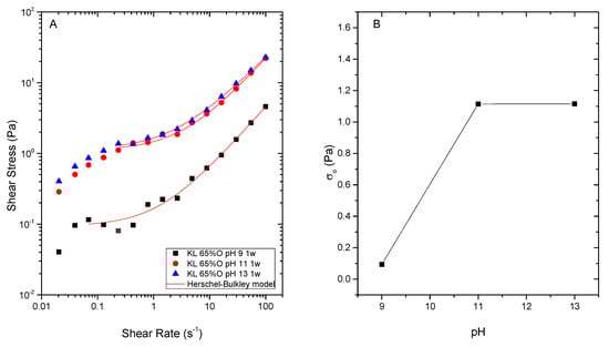 Figure 6. Effect of emulsification pH on silicone emulsions flow behaviour (A) and yield stress values (B) determined from Herschel-Bulkley model All emulsions were formulated with 65 wt.% O, stabilized by 0.5 wt.% Kraft lignin and measured after 1 week storage.