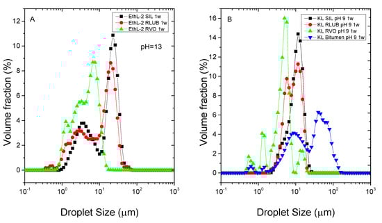 Figure 7. Droplet size distribution of bitumen rejuvenator emulsions stabilized by 0.5 wt.% bioethanol-derived (A) and Kraft (B) lignins.