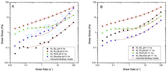 Figure 8. Effect of emulsification pH on the flow behaviour of bitumen emulsions stabilized by Kraft lignin after 1 week storage at pH 9 (A) and 11 (B).