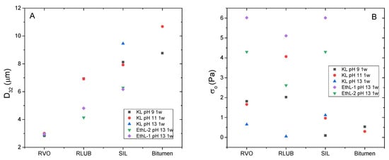 As may be seen, in contrast with recycled oils RVO and RLUB, pH mainly affects viscosity of bitumen emulsions, being emulsions formulated at pH 9 more viscous than that formulated at pH 11. In any case, RVO and RLUB lead to emulsions with higher viscosity than bitumen. This result is in good agreement with D3,2 value displayed in Figure 9A, where RVO and RLUB present the lower values of this mean diameter.