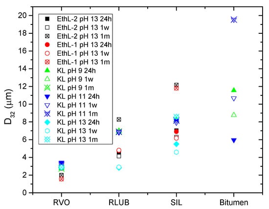 On the other hand, viscous and DSD combined results may be used for selecting best surfactants for every rejuvenator studied (Figure 9). Thus, although most emulsions exhibited a storage stability of at least 30 days, some emulsions formulated with KL and RLUB at pH 13 or with bitumen at pH 9, showed a shorter stability (Table 2). Both systems are characterized by large particle sizes along with low yield stress values (Figure 9), both factors would not prevent droplet motion, and an eventual phase separation. Conversely, lower particle size and higher yield stress values were found for both bioethanol-derived lignins emulsifying RVO and RLUB at pH 13, which are expected to exhibit enhanced stability. Figure 10 seems to confirm this assumption, since these systems hardly change their particle size with time. Regarding bitumen emulsions, best results are achieved with KL at pH 11, although lignin emulsions are characterized by high D3,2 and low σo values. Among all system studied, this emulsion undergoes the largest increase in particle size along storage time (Figure 10).