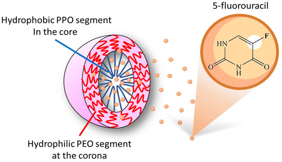 5-FU is a common chemotherapeutic medicine for intravenous injection or oral administration [19]. The chemical structure of 5-FU is depicted in Figure 1. Pluronic® polymers were self-assembled into Pluronic micelles with a hydrophilic PEO segment at the corona and a hydrophobic PPO segment in the core. Studies elucidated that 5-FU would be hydrophilic [20,21,22,23,24] or hydrophobic molecules [25,26,27,28]. However, for drug release, the encapsulation of the drug in micelles was highly dependent on its loading location rather than the intrinsic solubility of the drug in aqueous solution. Therefore, the important thing is how to extend the effective time of drug release from a designated polymeric area. This study used NMR technology to identify the position of the 5-FU medicine in the drug release carrier, trying to propose a mechanism simulating the microenvironment of the cell operation.