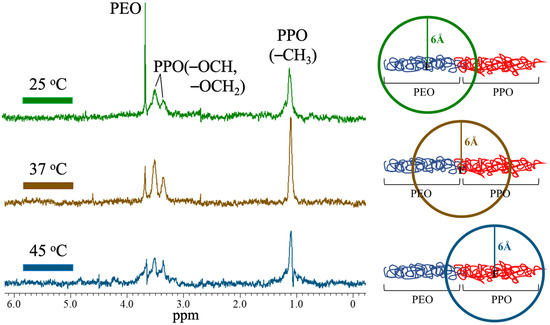 (Left): HOESY of the Pluronic blending composites with volume ratio of F127/L121 = 1/3 at 25 °C, 37 °C, and 45 °C. (Right): Schematic illusion of the molecular chain model in the spectra of HOESY.