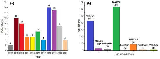 Statistical survey on recent publications: (a) polyaniline-based humidity sensors in the last decade; (b) total publications to date for polyaniline-biopolymer composites (according to the search queries stated in the graph). Source of data: Scopus; search time: 2 July 2021. Acronyms: CHT—chitosan, CHN—chitin, CLL—cellulose, HCL—hemicellulose, STR—starch, CDX—cyclodextrin, CRG—carrageenan. Chitaline was searched by a plain request “chitaline”.