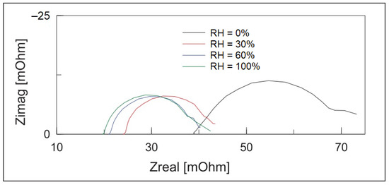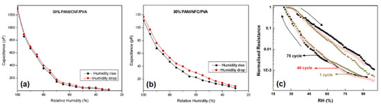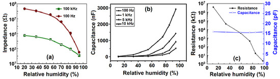 Figure 3c shows an exponential decrease of resistance and growth of capacitance that is RH-dependent. Notably, the capacitance of a resistive-type sensor stays constant over the wide range of humidity. In addition, the use of higher alternating current frequencies led to lower resistance and capacitance.