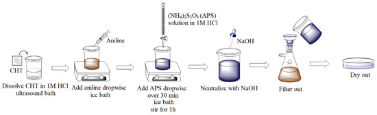 PANI/CHT binary composites are normally prepared by the chemical polymerization of aniline, with subsequent grafting onto chitosan in acidic media [84,85,86,87,88]. Since the conductivity of PANI depends strongly on its oxidation state, synthesis is often directed at the preparation of conductive emeraldine salt (PANI-ES) forms. Salt formation is aided by the use of dopants such as HCl or acetic acid, where some studies report the use of an intermediary neutralization step with NaOH (leading to a de-doped emeraldine base (PANI-EB) form), with subsequent re-doping upon the addition of an acid to obtain conductive PANI-ES [77,85,86]. Polymerization is carried out in the presence of an ammonium persulfate (APS) initiator. In general, aniline and powdered CHT are combined and treated with APS; however, one study reports the use of a prefabricated solid-phase CHT film that was submerged in an aniline-APS solution [89]. A generalized synthetic procedure is illustrated in Figure 5.