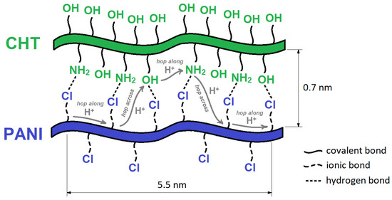 Mohamed et al. reported that the addition of CHT to PANI changed the ratio of B:Q units (in favor of Q units) [100]. The Q-units contribute to a more linear and rigid structure of PANI/CHT composites that may enhance the proton-hopping mechanism laterally between the chains of PANI and CHT (cf. Figure 9).