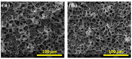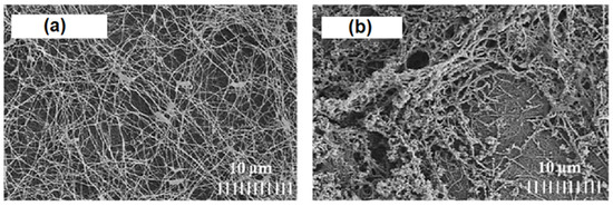 SEM micrograph of (a) bacterial cellulose; (b) PANI/BC composite. Reprinted with permission from [129]. Copyright 2018, Elsevier.