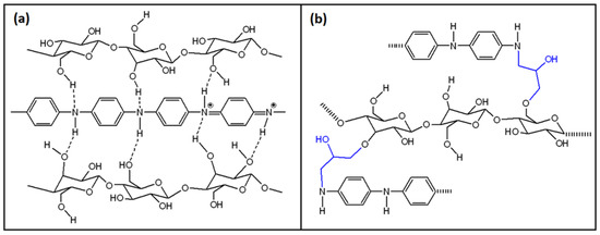 Schematic representation of polymer structures: (a) PANI/BC composite; (b) PANI/gEBC composite (cross-linker is highlighted in blue). Based on the results reported in [114,118,119,126]. EBC—epoxy-modified bacterial cellulose.
