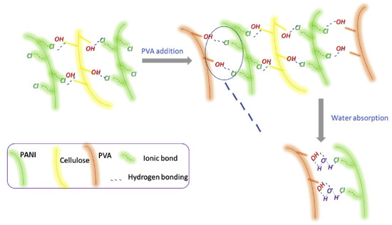The regulation of humidity plays a significant role in the maintenance of human health and providing comfortable conditions in many aspects of daily life. Relative humidity (RH) is related to the ratio of the partial pressure of water vapor to the total pressure of the saturated vapor at a given temperature and is often expressed in %. Humidity control within indoor environments, such as commercial and residential buildings, plays a role in maintaining the quality of infrastructure and consumable goods. For example, moisture can affect the stability of paintings, computers, plants, food, fruits, vegetables, egg incubation, coatings, chemicals, etc. Moisture-responsive materials have been tested and designed over the decades to monitor humidity in order to prevent the degradation of various items. They range from a simple human hair to sophisticated ceramics [1,2,3,4,5,6,7,8,9] or conductive polymer materials [10,14,15,16]. Among these systems, advances in the development of conductive organic polymers have resulted in lightweight, compact, and cost-effective materials that have widened the conventional scope of application beyond traditional ceramic and carbonaceous materials [17]. In this category, PANI has promoted ongoing research interest due to its intrinsic conductivity, where it can be used exclusively as a humidity-responsive material. However, to enhance its properties, PANI can be prepared in the form of composites by the addition of biopolymer additives, such as starch [18,19,20], cellulose [21,22,23] and chitosan [24,25,26].