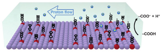 In this case, hydrogen ions are the dominant carriers of the electric charge on the superficial aqueous layers [32]. Another possible mechanism of the electric charge transport process is also based on the transmission of hydroxide ions [33]. When a water molecule eliminates H+, it contributes to the protonation of an adjacent H2O molecule, resulting in the formation of OH−, as follows: