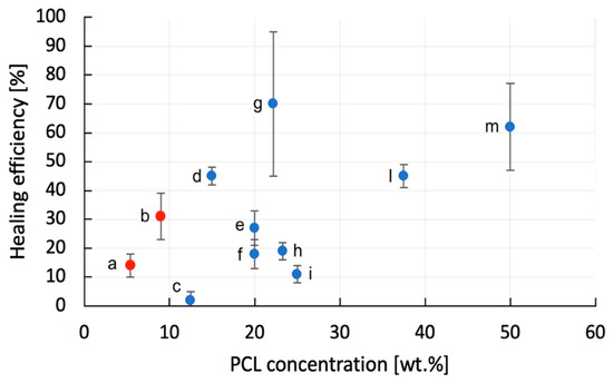 | c | EP/PCL blend | 12.5 | 30 min at 80 °C | Max load in compact tension test | 2 ± 1 | [22] |