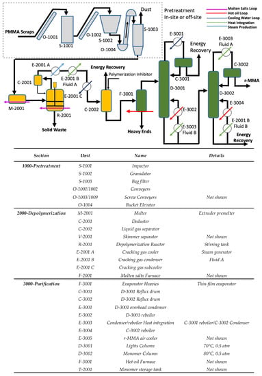 Although no process route is dominating worldwide [10], some are preferred when lower quality r-MMA is acceptable, or less capital-intensive plants are required. For instance, dry distillation plants have a low capex, but produce a lower quality monomer (<98% wt.), nevertheless accepted in the local markets (e.g., India, China, Brazil) [10,16,17]. Molten lead baths, instead, are very sensitive to PMMA scraps quality, and have a proven track record with high-quality waste [10,18]. The MMAtwo twin-screw extruder technology depolymerized several post-industrial, and end-of-Life PMMA grades, into a r-MMA as pure as 99.8 wt. % (after distillation) [19]. However, this comes with a higher capital investment, compared to dry distillation, for instance. Theoretically, the ideal technology not only produces the best product from the worst waste, at the lowest capital investment, but it also eases as much as possible its environmental footprint. For this reason, we report the flowsheet of our own PMMA design of recycling process, organized here to be a compromise or average representative of the existing technologies and heavily energy integrated (Figure 1 and Figure 2).
