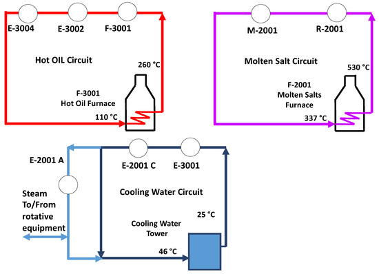 The by-products combustion provides heat energy and steam for the rotative equipment. Natural gas complements the heating duty required. Natural gas and by-products fuel a molten salt, and a hot oil circuit. The molten salt loop supplies the heat to the reaction section, while a hot oil circuit supplies the purification section. Because of the high energy content of the by-products (comparable to that of MMA—26.2 MJ/kg [23]), the energy recovered from their combustion is high enough to satisfy almost all the energy requirements of the process, with only a little natural gas contribution.
