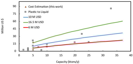 In Figure 3, we report the capital cost versus capacity of some selected projects scaled to 2019 in France, as well as the estimated capital cost. For a 5000 tons/y plant, the two Lange methods reach their validity limit, (under)estimating a capex of 3.3 M USD, and 7.2 M USD respectively. The Petley method probably overestimates the capex at 18 M USD. Both methods are indeed “Class V” for process engineers, or technology readiness level “TRL 3–4” for chemists, and they carry significant uncertainties. For comparison, for similar plant sizes, announced investments for recycling plant were between 11 M USD, and 25 M USD for the first of a kind (FOAK) Plastic energy Plastic to Oil plant [36]. Obviously, FOAK plant are more expensive than nth of a kind (NOAK) for the same technology/company, because of learning curve and technology maturity [37]. For instance, this is the case of Plastic Energy, Quantafuel, or QM Recycled Energy, in Table 2.