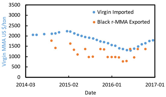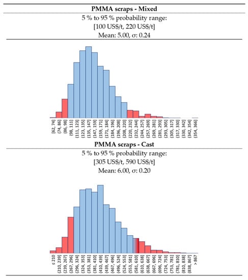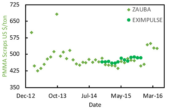 The MMAtwo consortium estimates that before the Chinese trade ban, Europe was exporting between 15 000 tons/y and 30 000 tons/y to India and China [10], with around 8 000 traded within Europe [9,10]. Hence, we collected some market prices for PMMA scraps for the 2013–2016 period in the major ports of India (Figure 4) from Zauba [51], and Eximpulse [52]. What we see here are relatively good quality scraps, most likely cast materials, traded as “Acrylic scraps HS39159030”. Lower quality scraps are difficult to trace, also because they might be sourced from the local market. For this reason, we assumed two different statistical distributions for the PMMA scraps (Figure 5):