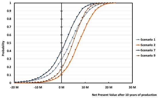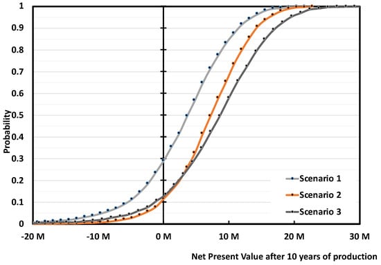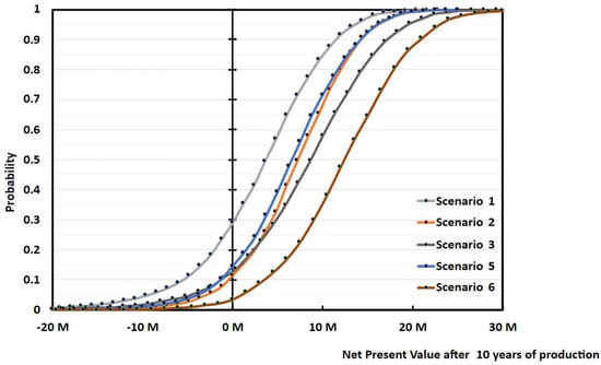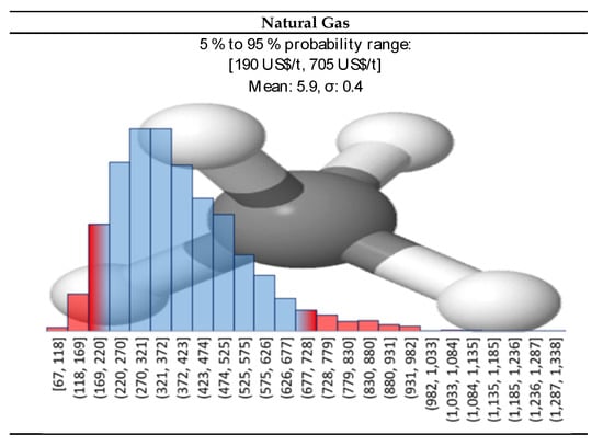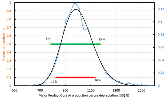 To factor-in all the variables uncertainties at once, as opposed to inspect only one variable at the time (sensitivity analysis), we performed a probability risk analysis, also known as Monte-Carlo simulations. The way we described it so far, the NPV method is a deterministic method, meaning that we obtain a single output when plugging in a fixed input. However, if we input probabilistic distributions instead, we obtain an output with its own probabilistic distribution. In the Monte-Carlo simulation technique, each input has its own statistical distribution (normal, log-normal, gaussian, gamma, etc.,), from which the calculator selects one random value. From the random input series, the simulation calculates the output variable, for instance the NPV. The process is then repeated a high enough number of times so that the output becomes reliable, for instance in the order of thousands. Eventually, out of the frequency of recurring of each outcome, we can calculate the probability of happening of a certain outcome (e.g., NPV on a certain year). The Perry’s Handbook, or our previous paper on Risk assessment using Monte-Carlo simulation is a good starting reference on this technique [25,49,50].