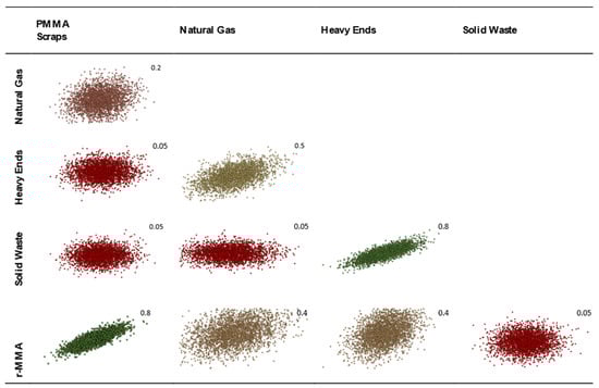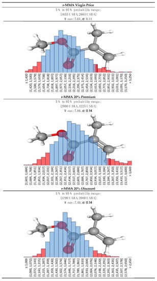 - Based on production price index-adjusted historical data, set a statistical distribution for the future price of raw materials (PMMA, natural gas), waste (solid wastes and heavy ends), and product (r-MMA);