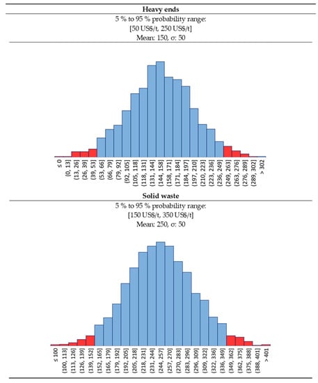 The Monte-Carlo simulation copes with the uncertainties on raw material price, waste price, product price, and investment. This approach is very appropriate, as a risk analysis, in this very early stage evaluation of processes, to identify the most viable scenario leading to a successful project. We kept all the other values as a fixed deterministic variable (labor cost, other utilities cost, depreciation, taxes, all the other fixed costs).