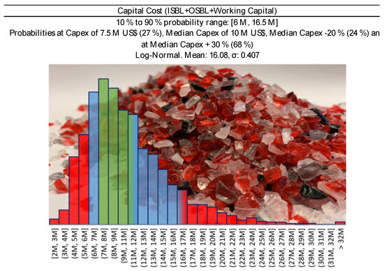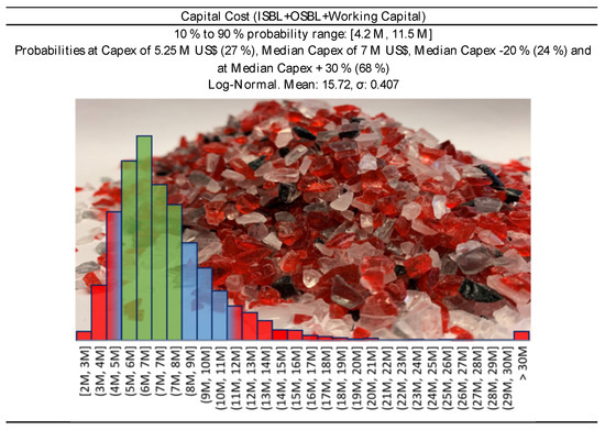 where is the Cost (ISBL or OSBL, etc.) and the plant size, the scaled 5000 tons/y would therefore be in the 6 to 16.5 M USD range. On the basis of different evaluation methods, we assumed a reference capital investment of 7.5 M USD, that translates into a median (p50) CAPEX of 10 M USD (p10 at −20% reference Capex (i.e., 6 M USD); and p90 at +120% (i.e., 16.5 M USD)—Figure 3), and which also includes working capital and start-up costs. When a plant starts, it always needs raw material/product stocks, and some budget allocated for unforeseen contingencies.
