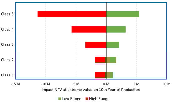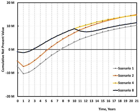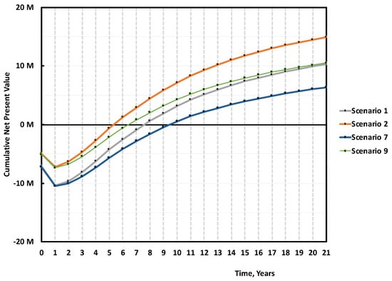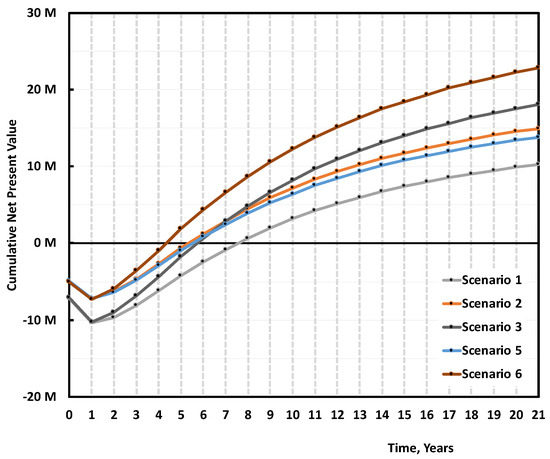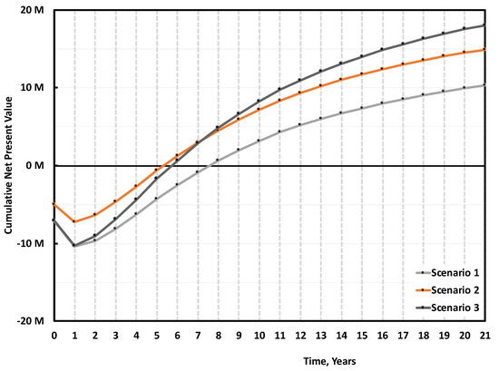 When the NPV is positive, the project earns more than the interest (discount) rate selected, or the best alternative project [25]. The annual operational cash flow CFn is the sum of the annual net profit after taxes (ANP), and the depreciation D: