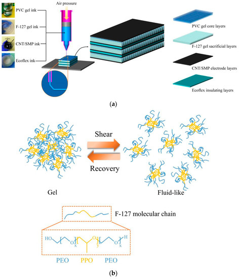 As shown in Figure 2a, CNT doped shape memory polymers (CNT/SMP) were chosen for printing PVC-gel electrode because the electrodes’ hardness is suitable [31]. The Ecoflex silicone materials, which possess very high insulation performance, were designed for connecting PVC-gel actuator units. To fabricate the flexible artificial muscle structure, it was first necessary to prepare inks suitable for direct writing and to satisfy the functional requirements for core layers, sacrificial layers, electrode layers, and insulating layers. Using a printing device with a pneumatic ink extrusion system (Figure S1), each functional layer was printed in sequence with the prepared inks to produce the composite structure. In particular, pluronic F-127 is a polyethylene oxide (PEO)-polypropylene oxide (PPO)-polyethylene oxide (PEO) triblock copolymer. As shown in Figure 2b, F-127 has thixotropic properties. When the ink was prepared, the molecules cross-linked with each other to form gel networks. When the gel was subjected to shear stress, the networks broke down and the ink became fluid-like so it could be conveniently extruded through a nozzle. After the shear stress was removed, the ink quickly turned to gel with rigidity that could help maintain the shape of the printed structure. In this paper, the F-127 gel inks were printed for constructing a corrugated PVC-gel core structure.