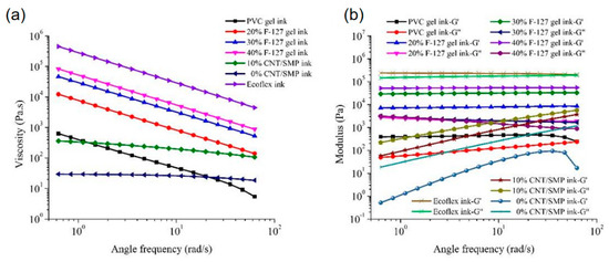 Preparation and performance characterization of the inks. (a) Viscosity and (b) moduli (storage modulus G′ and loss modulus G″) of the PVC gel ink, F-127 gel ink with different concentrations, pure SMP ink, CNT/SMP ink, and Ecoflex ink as a function of the angular frequency.