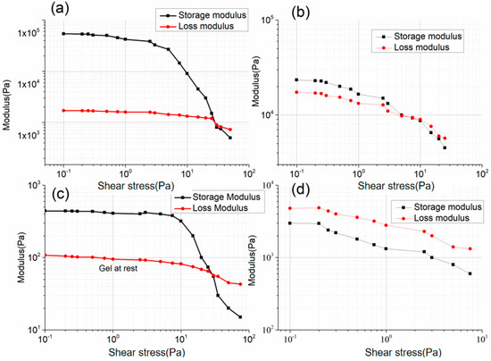 Plot of the storage modulus and loss modulus as a function of shear stress. (a) PVC-gel ink, (b) F-127 gel ink, (c) Ecoflex ink, (d) CNT/SMP composite ink.