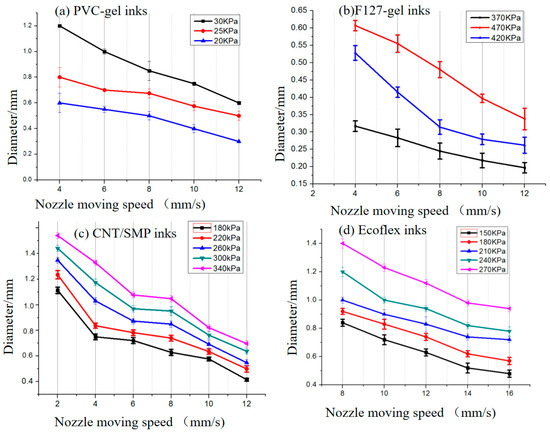 Influence of the extrusion pressure and nozzle moving speed on the printed diameter (a) PVC gel ink, (b) F-127 gel ink, (c) CNT/SMP ink, (d) Ecoflex ink.