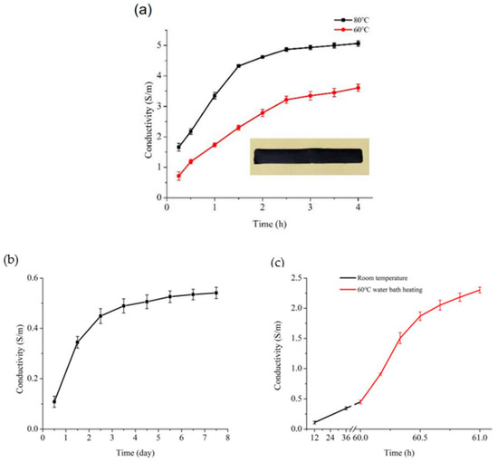 The conductivity of the CNT/SMP composite inks as functions of time (a) at 80 °C, 60 °C, (b) room temperature (25 °C), and (c) stepwise curing conditions.