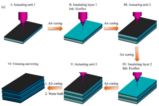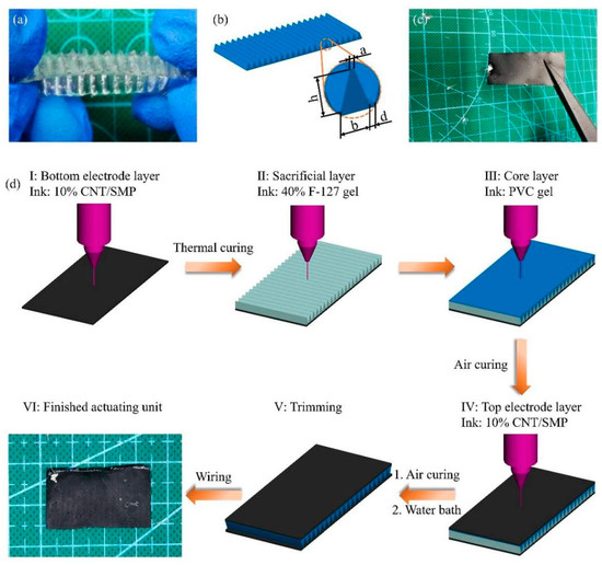 As shown in Figure 7d, single layer actuators (actuating units) were first printed. At the beginning, the bottom electrode layer was printed and then heated in a vacuum oven at 80 °C for 3 h to completely cure. Subsequently, the sacrificial layer was printed over the bottom electrode layer. The PVC gel core layer was then printed on the sacrificial layer to fully fill and cover the pores of the sacrificial layer, and the sample was stored at room temperature for approximately 12 h until the THF was sufficiently volatilized and the PVC gel was cured. The top electrode layer was then printed on the core layer, and the sample was stored at room temperature for 60 h until the top electrode layer was cured. After printing, the following post-processing of the sample was performed. First, the composite structure was heated in a water bath at 60 °C for 30 min until the sacrificial layer was completely dissolved. Next, after drying, the edges of the sample were cut to avoid contact between the two electrode layers at the edges, which may result in short circuit of the actuator during testing. Finally, stainless steel wire and conductive silver paste were used to create a lead from the two electrode layers. After heating at 60 °C for approximately 15 min to solidify the conductive silver paste, the integrated printed corrugated PVC gel actuating unit was complete.